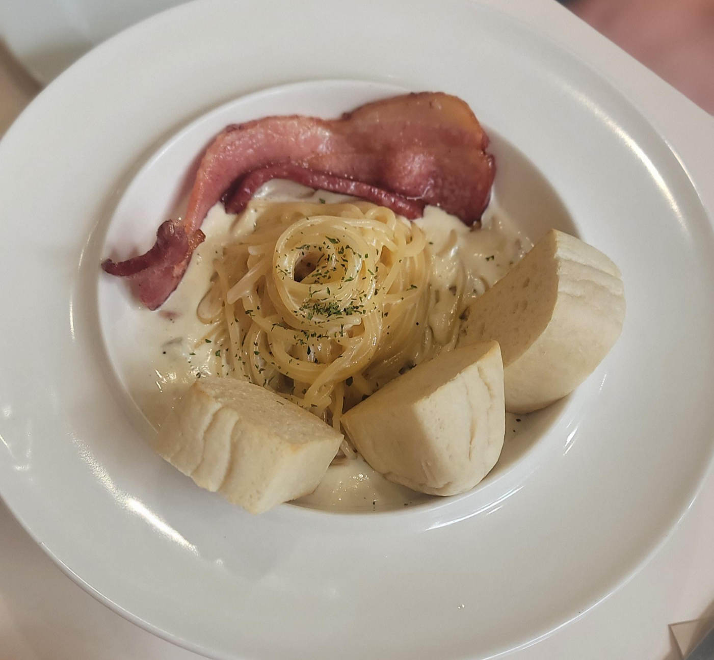 치아바타빵과 통베이컨이 담겨있는 #치아바타 통베이컨 파스타