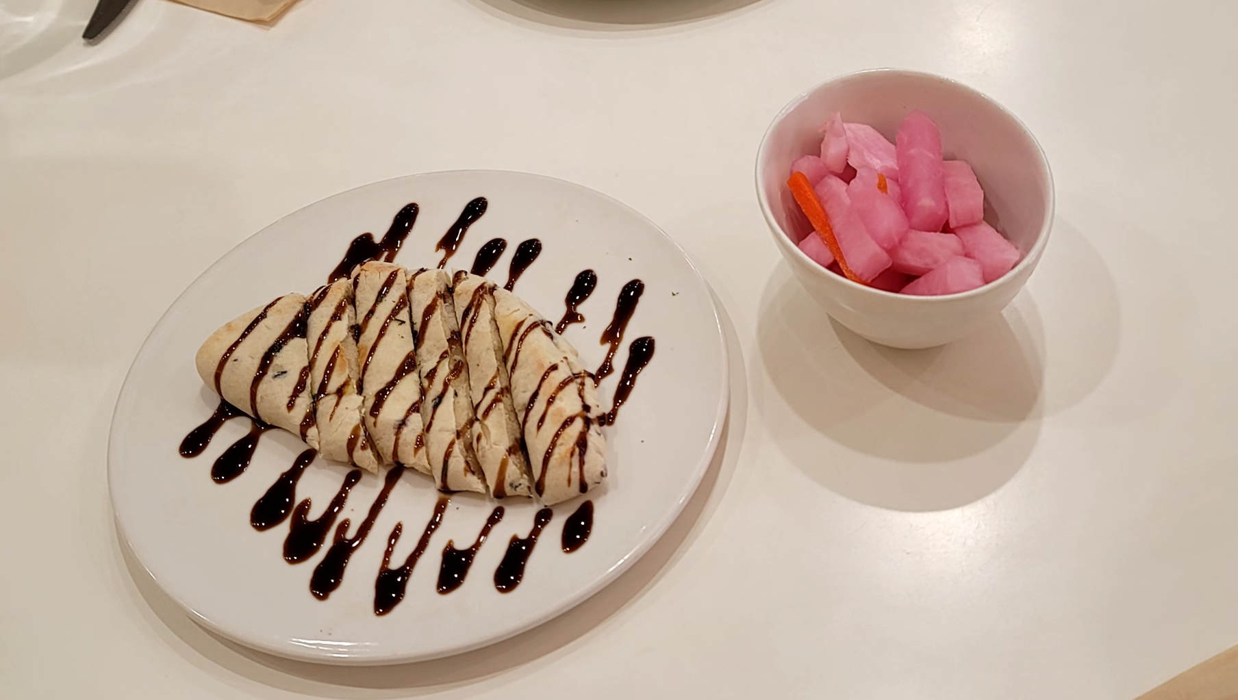 고소한 또띠아와 치즈에 새콤한 발사믹 소스가 뿌려져